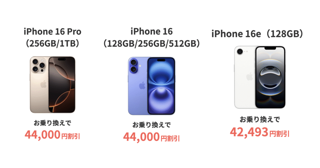 最新機種発表の影響で、iPhone16シリーズが大幅値下げ。物理SIM対応の16 Proは特に人気で、割引幅が過去最大級になっています。
