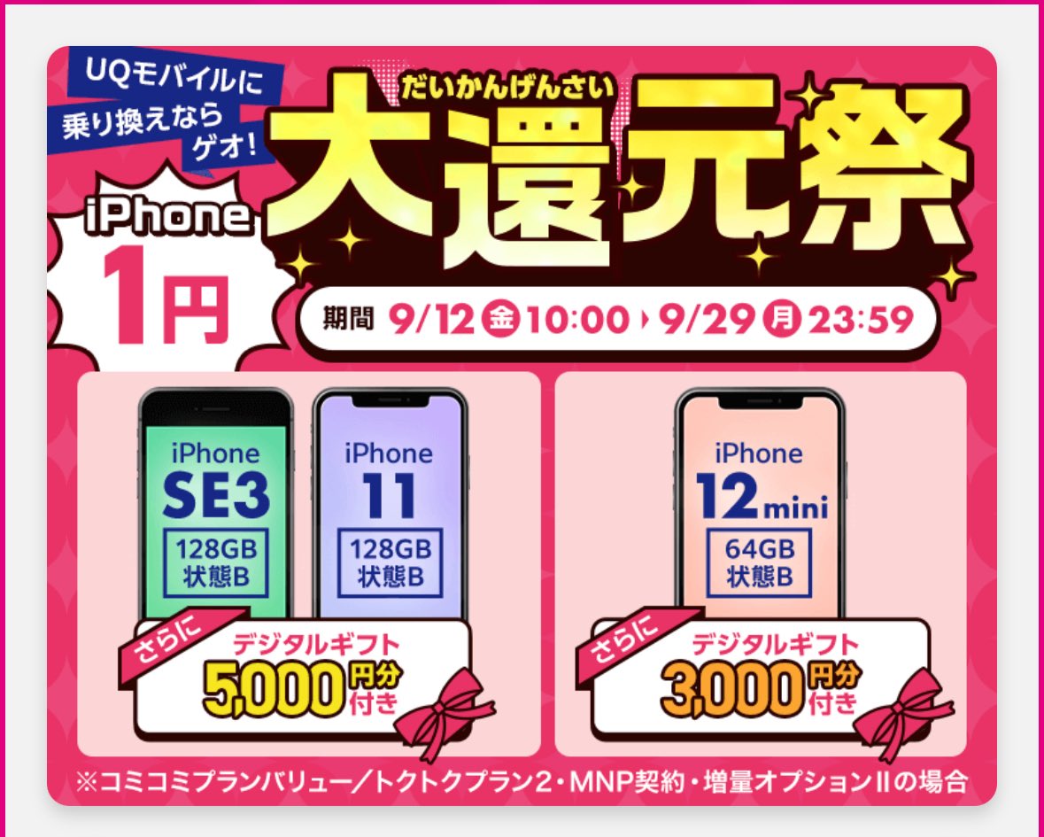 UQモバイル過去最大級のiPhone一括1円キャンペーン!