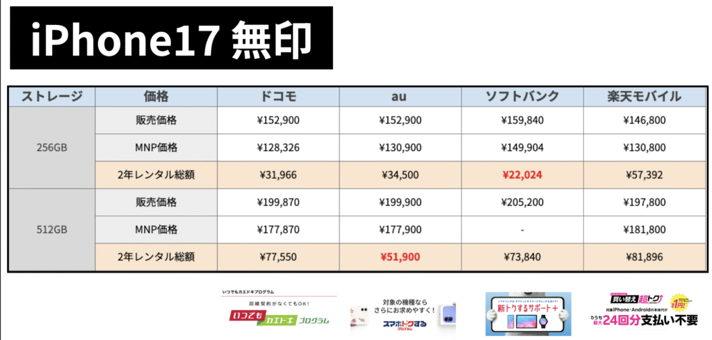 発売直前のiPhone17は、各キャリアで大幅な割引が実施されています。特にソフトバンクが最安となっています。