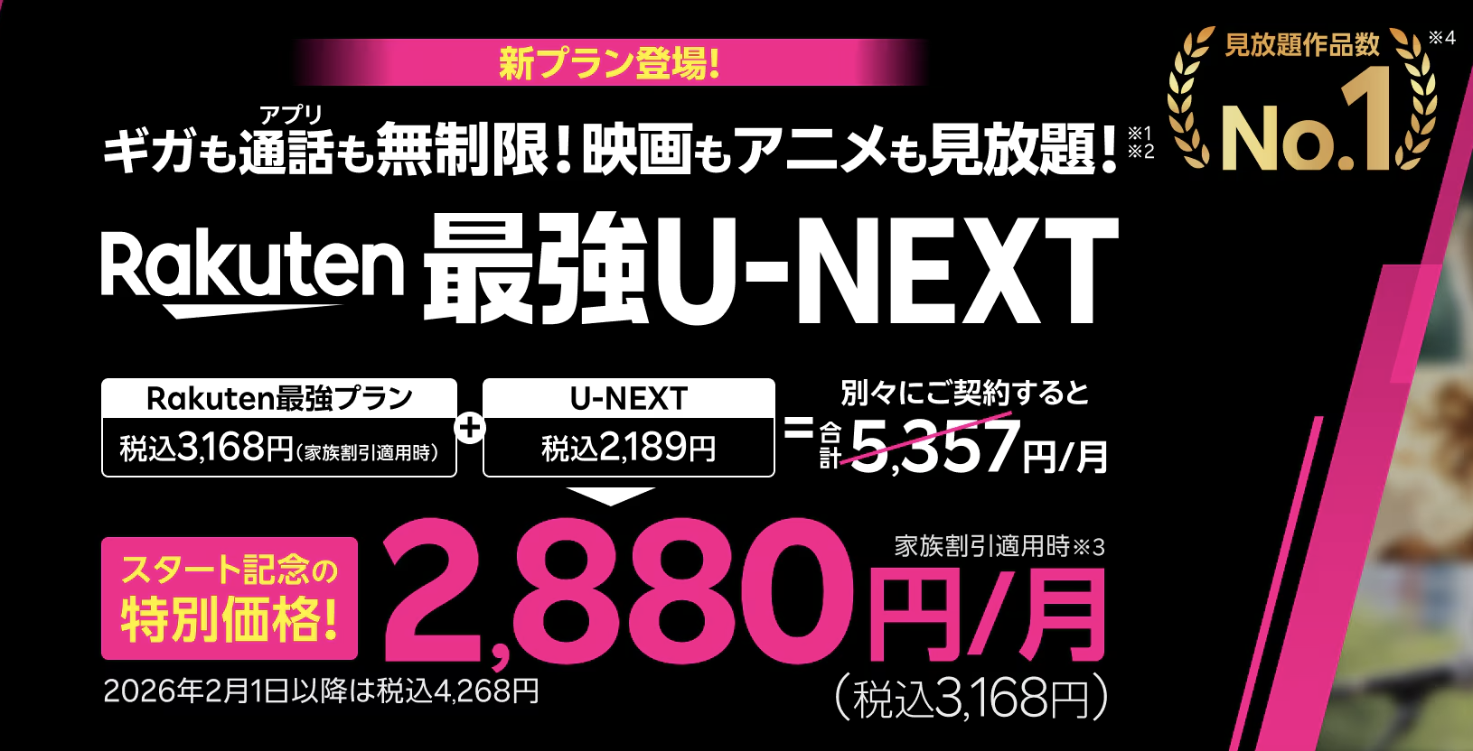 通常の楽天最強プラン(ギガ無制限3,278円)に、U-NEXT(映画・アニメ・ドラマ・雑誌・漫画見放題 2,189円)が無料でついてきます。