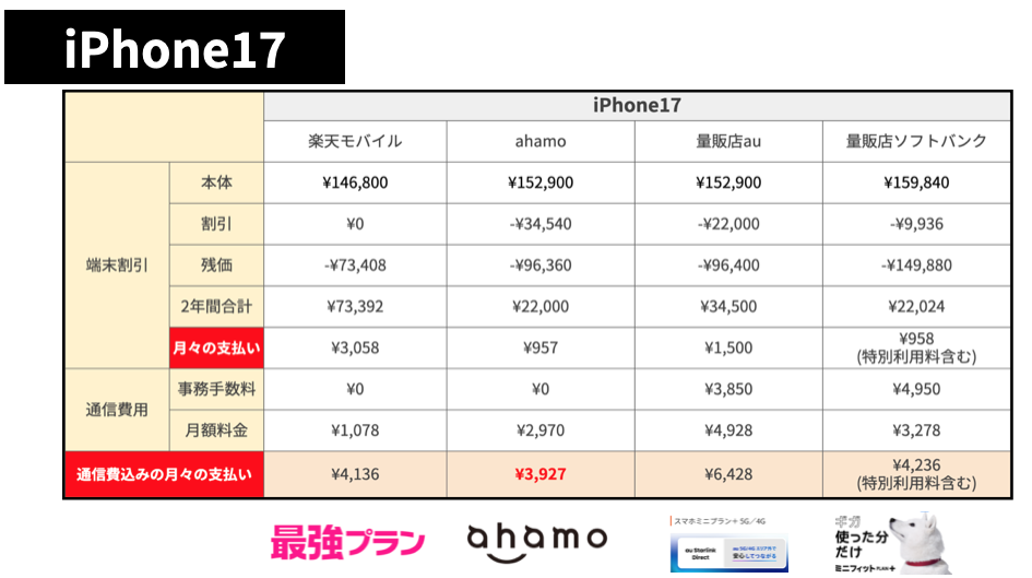 まずはiPhone17の最新キャンペーンを比較してみましょう。主要キャリア4社(楽天モバイル・ahamo・au・ソフトバンク)を並べると、レンタル条件での実質負担額に大きな差があります。