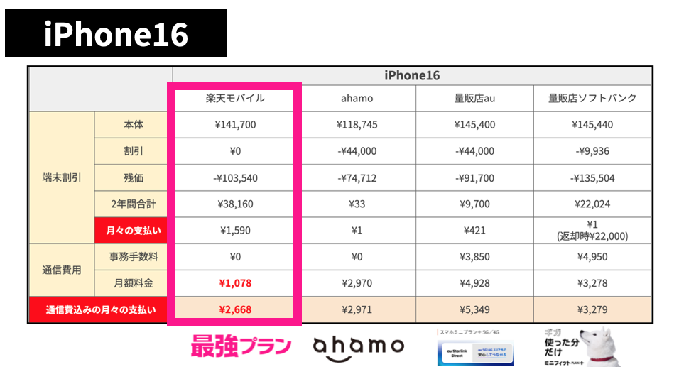 一見、ahamoやソフトバンクが安く見えますが、返却条件や手数料を考慮すると楽天モバイルが最も総額を抑えられる結果に。 さらに楽天は事務手数料が0円、乗り換え手続きもオンライン完結で簡単です。