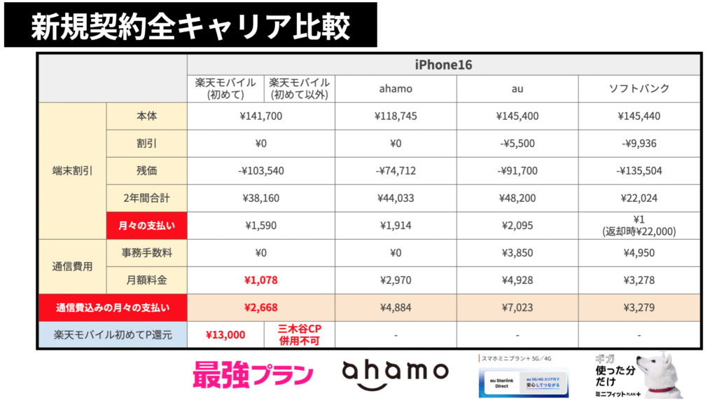 iPhone16を新規で契約するなら、総支出・特典・通信費の3点で楽天モバイルが最も優れています。