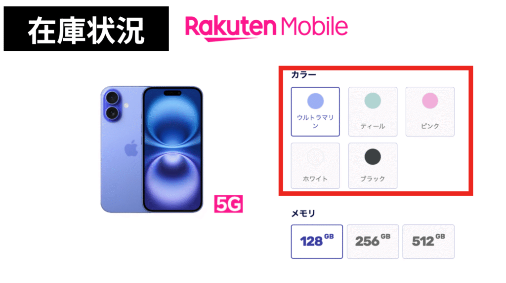 楽天モバイルでは、初めて契約する方限定で13,000ポイント還元が適用されます。また、端末カラーも豊富で、他社で在庫薄の「ウルトラマリン」「ティールピンク」も選択可能です。
