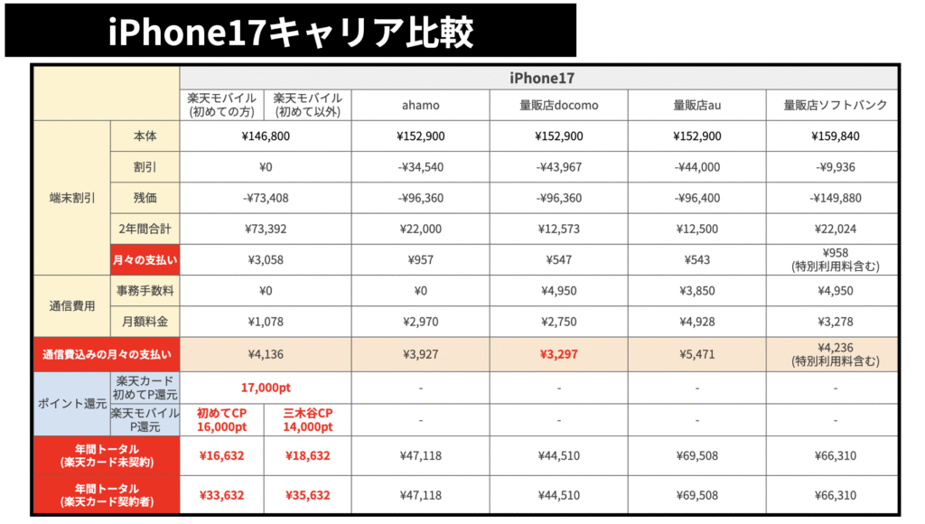 今回の値下げ合戦で、au・ソフトバンク・ドコモ・楽天モバイルの4社が熾烈な競争を展開しています。通信費を含めたトータルコストで見ると、楽天モバイルまたは量販店ドコモが最もバランスが取れておりおすすめです。