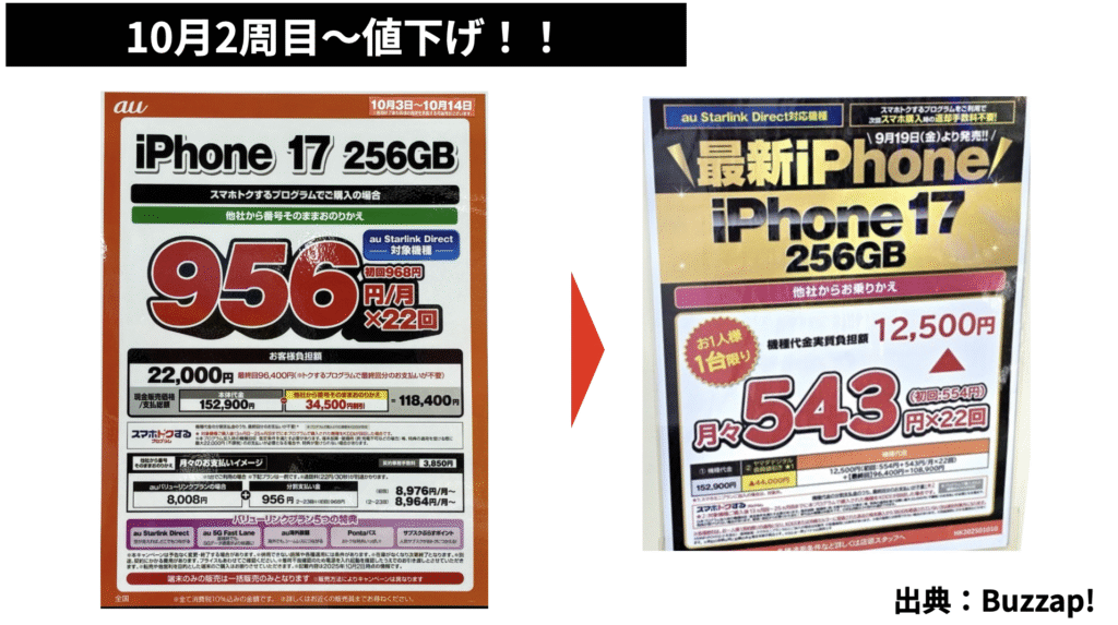 10月第2週、auが「iPhone17」のレンタルプログラムを大幅に値下げ。従来の956円から543円へと約半額となりました。これにより、ソフトバンクの1円プランに対抗する形で、他社も追随する動きを見せています。