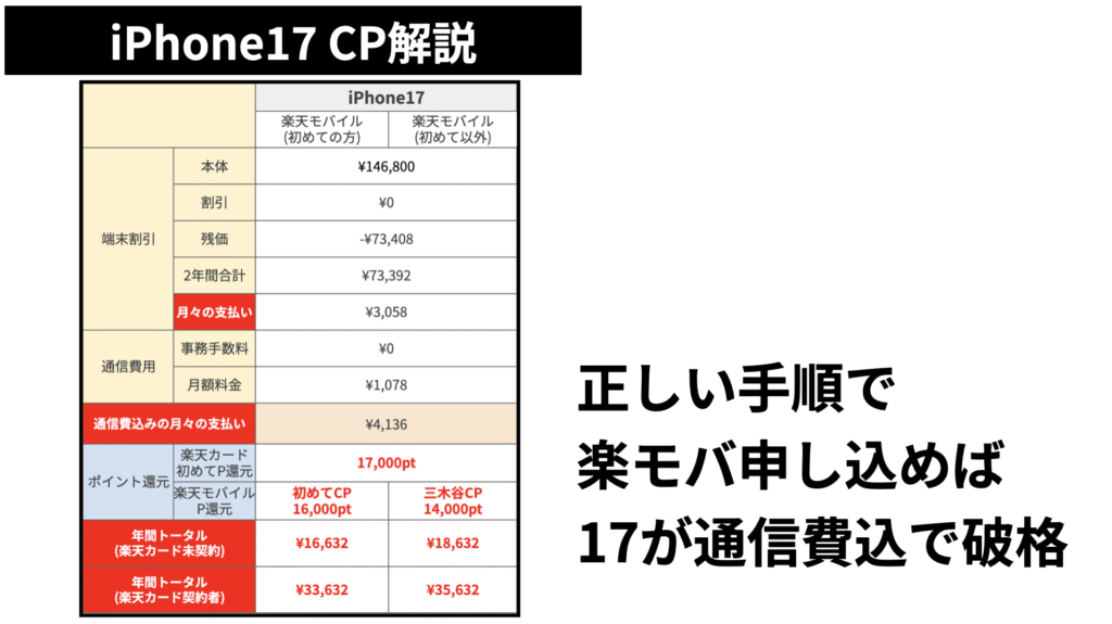 端末価格ではやや高めの14万円ですが、月額料金とポイント還元を組み合わせると、通信費込みで4,136円と実質最安水準。初回特典やエントリーキャンペーンを活用すれば、総支出をさらに抑えることが可能です。