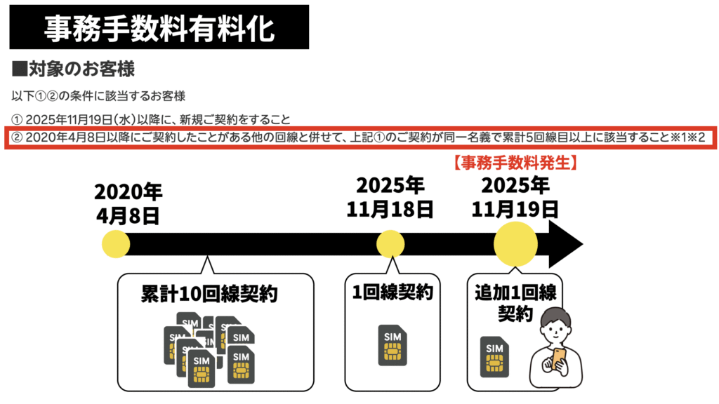 もし次の契約が累計5回線目に該当する可能性があるなら、2025年11月18日までに契約を完了させましょう。それ以降は1回線追加するたびに3,850円の手数料が発生します。ルール変更前の今が、最後の“無料契約チャンス”です。