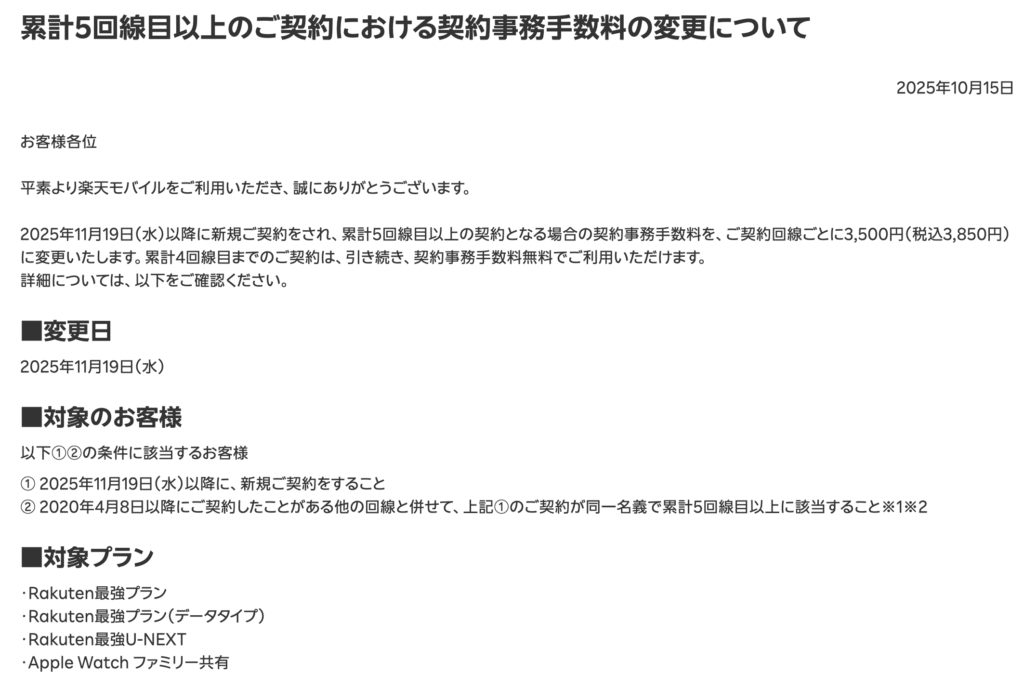 今回の変更は「2020年4月8日以降に契約したことがある回線」を含む累計でカウントされ、5回線目以降の新規契約や乗り換え時に手数料が発生します。つまり、過去に楽天モバイルを何度も契約・解約してきた人も、累計で5回を超えると対象になる点がポイントです。