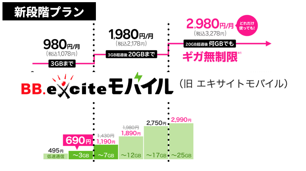 通信業界が再びざわついています。楽天モバイルの「無制限で月3,000円以下」「3GBで980円」という圧倒的なコスパを超えるような、まさかの無制限495円というプランが登場しました。その名も「BB.exciteモバイル」。段階制プランの中でも中容量ユーザーを狙い撃ちした、まさに楽天モバイル徹底対抗プランです。