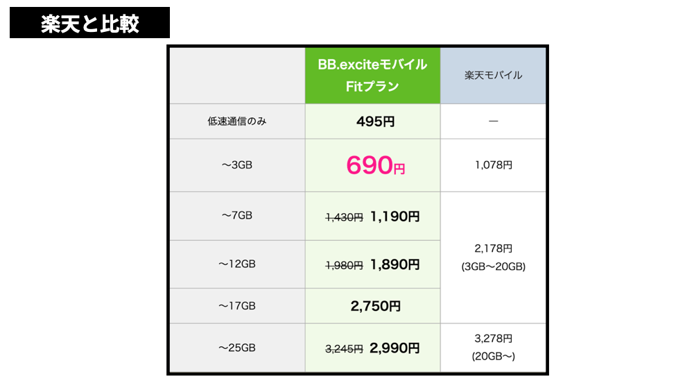 楽天モバイルは3GB〜無制限を3段階で提供していますが、BB.exciteモバイルは3GB〜20GBの中間層を細かくカバー。実際に「20GBもいらないけど10GBくらいは使いたい」というユーザーにとって理想的な料金設計になっています。