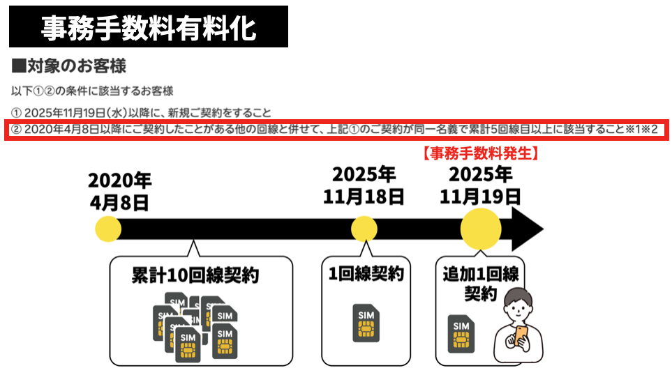 11月19日(水)以降、累計5回線目以上の新規契約は契約事務手数料3,850円が発生します。対象になり得る人は、導入前に必要回線を0円で確定し、名義と回線計画を整理しておきましょう。