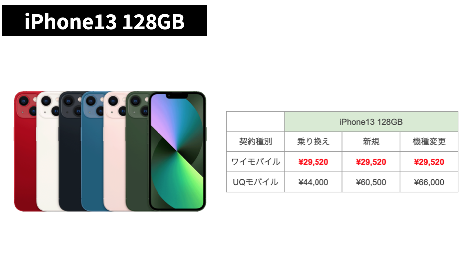 - iPhone 13(128GB):ワイモバイル 約29,520円/他社 約38,000円以上