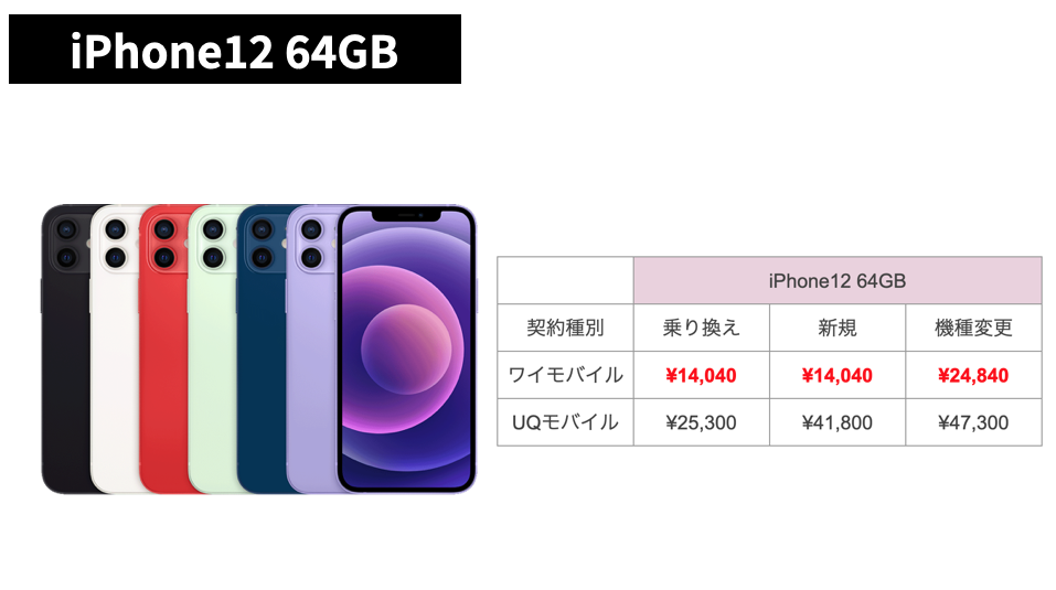 - iPhone 12(64GB)新規:ワイモバイル 14,040円/UQモバイル 約24,840円