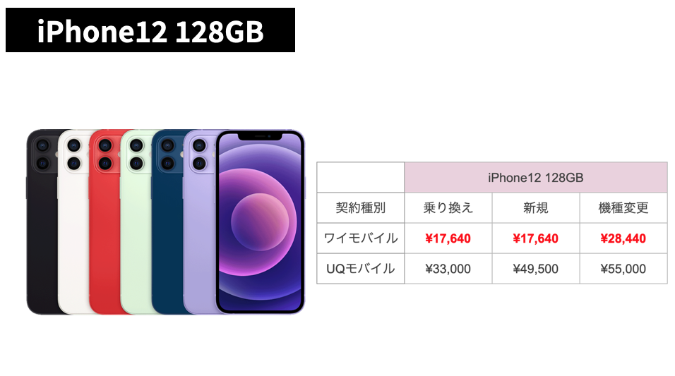 - iPhone 12(128GB):ワイモバイル 17,640円/UQモバイル 約28,000円