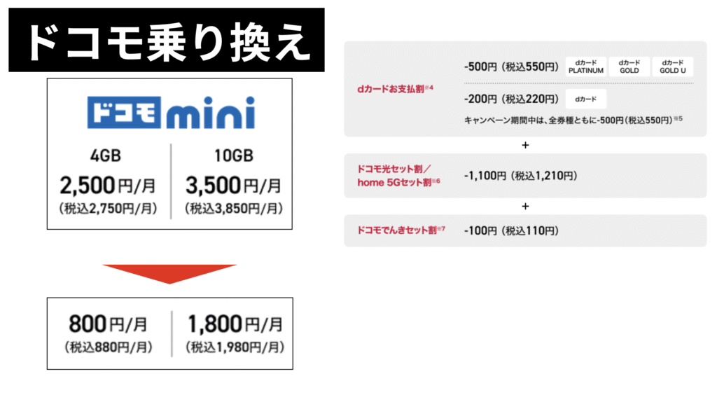端末割引と合わせて、月額料金も節約可能。ドコモの「ミニプラン」なら4GBで月2,750円(税込)。さらにDカード払い・ドコモ光・ドコモでんきなどを組み合わせると追加割引が適用されます。